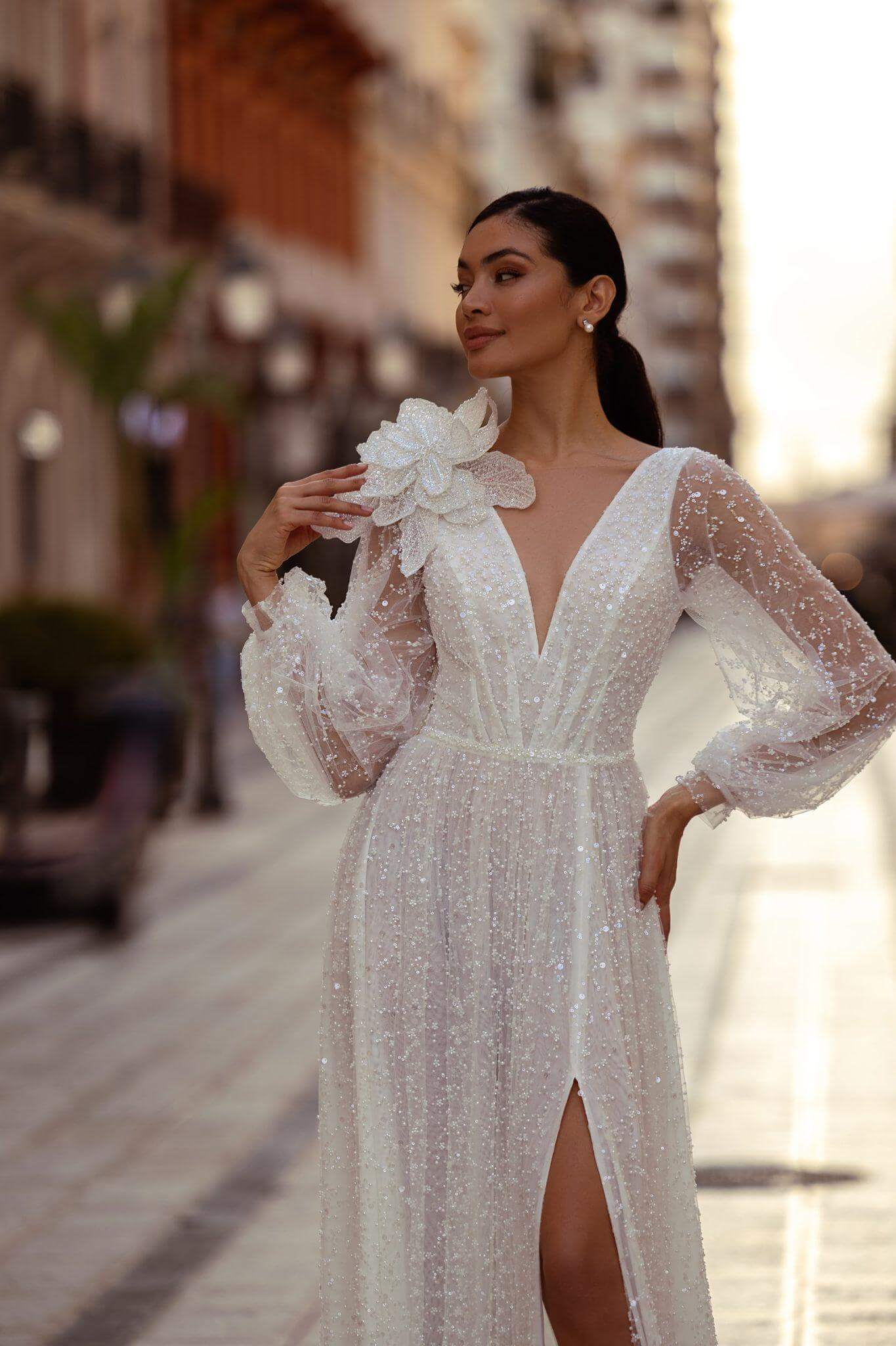 Dugi prozračni rukavi i V izrez na dekolteu unose dašak sofisticiranosti, dok su svetlucavi kristali na celom modelu zaduženi za neodoljiv glamur i sjaj.