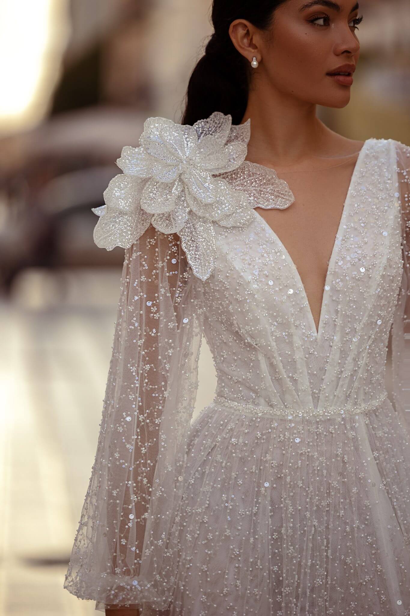 Na ramenu se nalazi prelep cvetni detalj koji doprinosi romantičanom i nežnom utisku , dok bočni prorez na nozi donosi element iznenađenja i ističe eleganciju i senzualnost mlade.