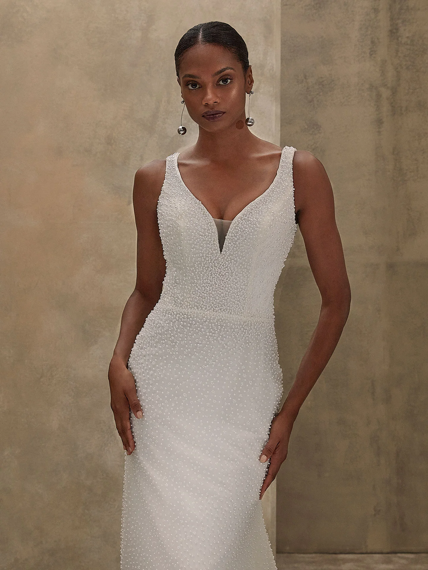 Ova sofisticirana venčanica odiše modernom elegancijom i bezvremenskim stilom. Uska column silueta prati liniju tela i nežno naglašava figuru, stvarajući izdužen i elegantan izgled. Cela haljina ukrašena je sitnim perlicama koje su pažljivo raspoređene po mekanom tilu, dajući suptilan sjaj i bogatu teksturu. Duboki V-izrez na dekolteu unosi dozu senzualnosti, dok otvorena leđa dodatno naglašavaju ženstvenost i eleganciju. Minimalistički kroj u kombinaciji sa raskošnim detaljima čini ovu venčanicu savršenim izborom za mladu koja želi moderan, prefinjen i istovremeno romantičan izgled na svom posebnom danu. Lagani materijal omogućava udobnost i graciozno kretanje.