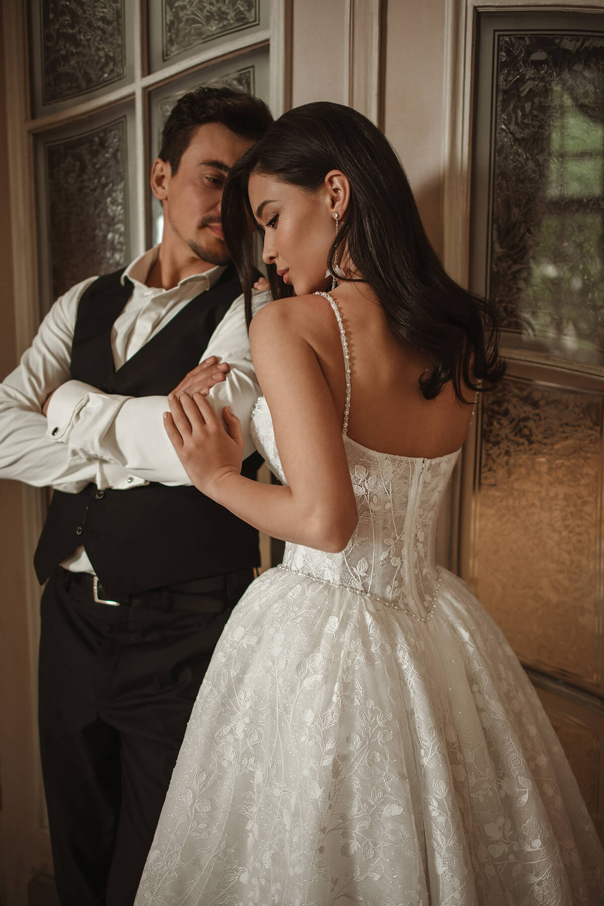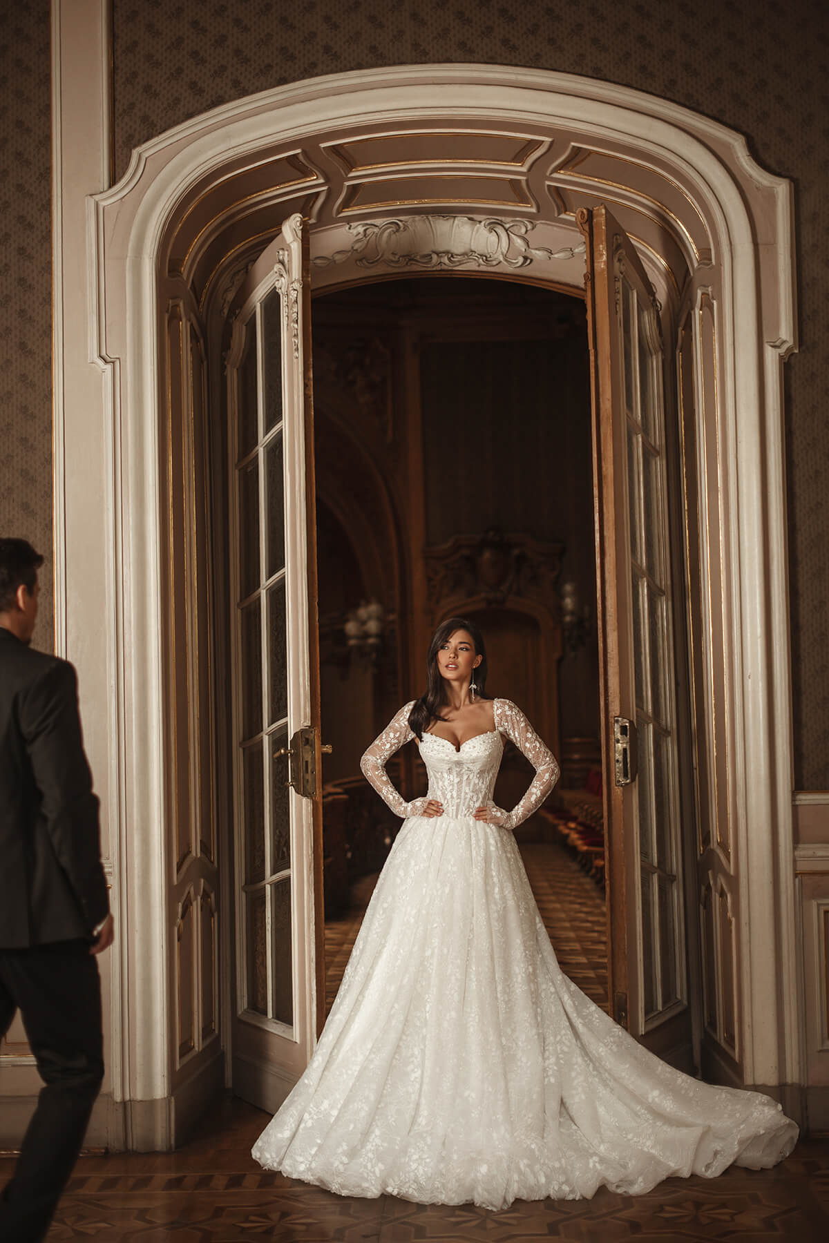 Ova romantična princeza venčanica od čipke odiše klasičnom elegancijom i sofisticiranošću. Njena leđa krasi tradicionalno vezivanje na pertle, dok duga i raskošna suknja pruža dramatičan i veličanstven izgled. Posebno je upečatljiv korset koji je u potpunosti ukrašen perlicama i kristalima, dodajući sjaj i savršenu strukturu, a uz njega dolaze i rukavice koji unose dozu posebnog šarma.