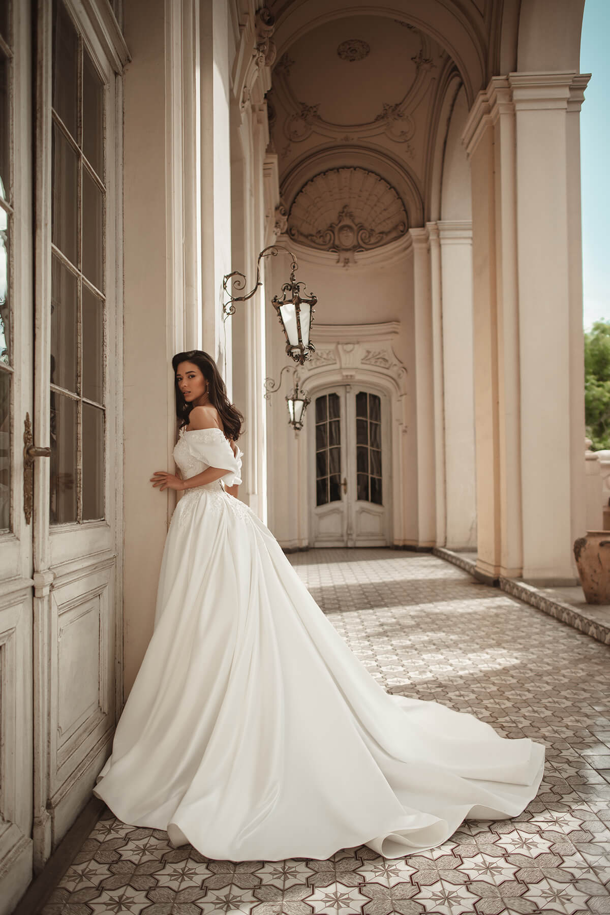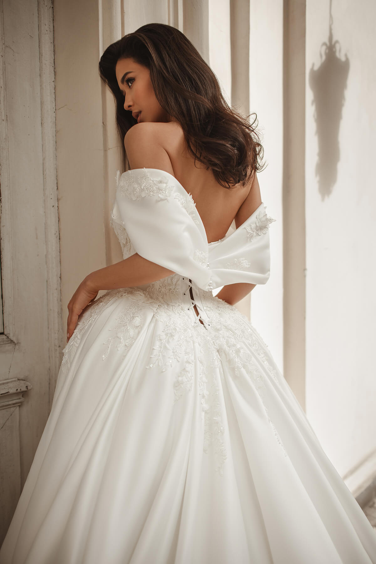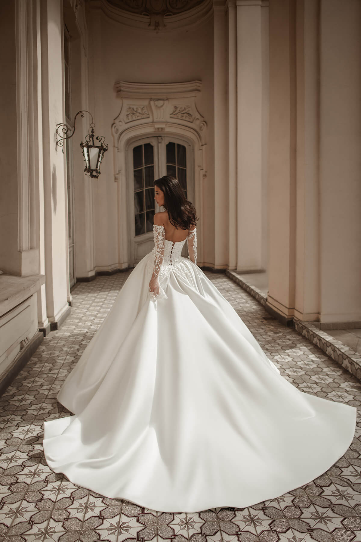 Graciozna i raskošna, ova princeza od satena stvorena je da ostavi snažan utisak. Gornji deo je čvrsto oblikovan i ukrašen nežnim cvetnim vezom, koji daje notu sofisticiranosti. Haljina dolazi sa uklonjivim bretelama koje se spuštaju sa ramena, kao i čipkastim dugim rukavima što omogućava da izgled bude klasičan, ali i lako prilagodljiv.