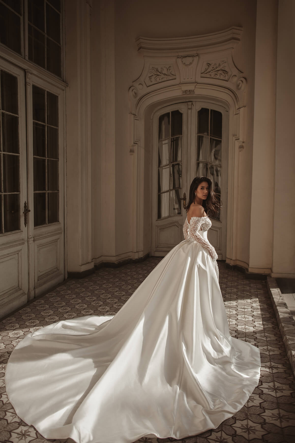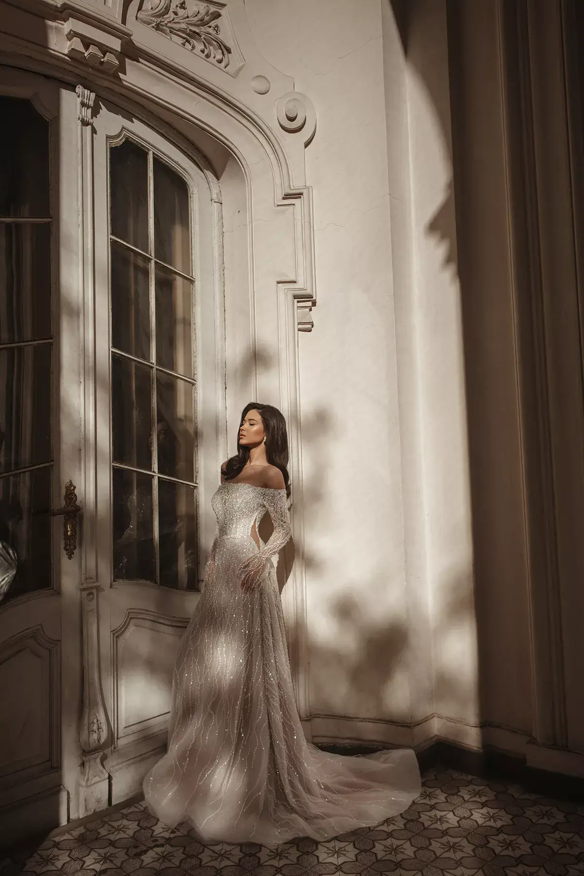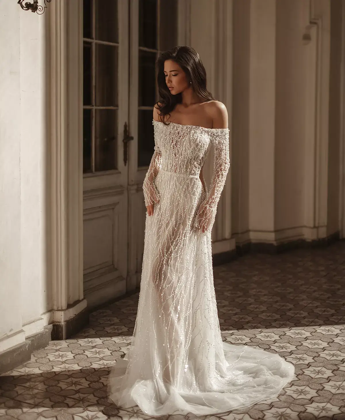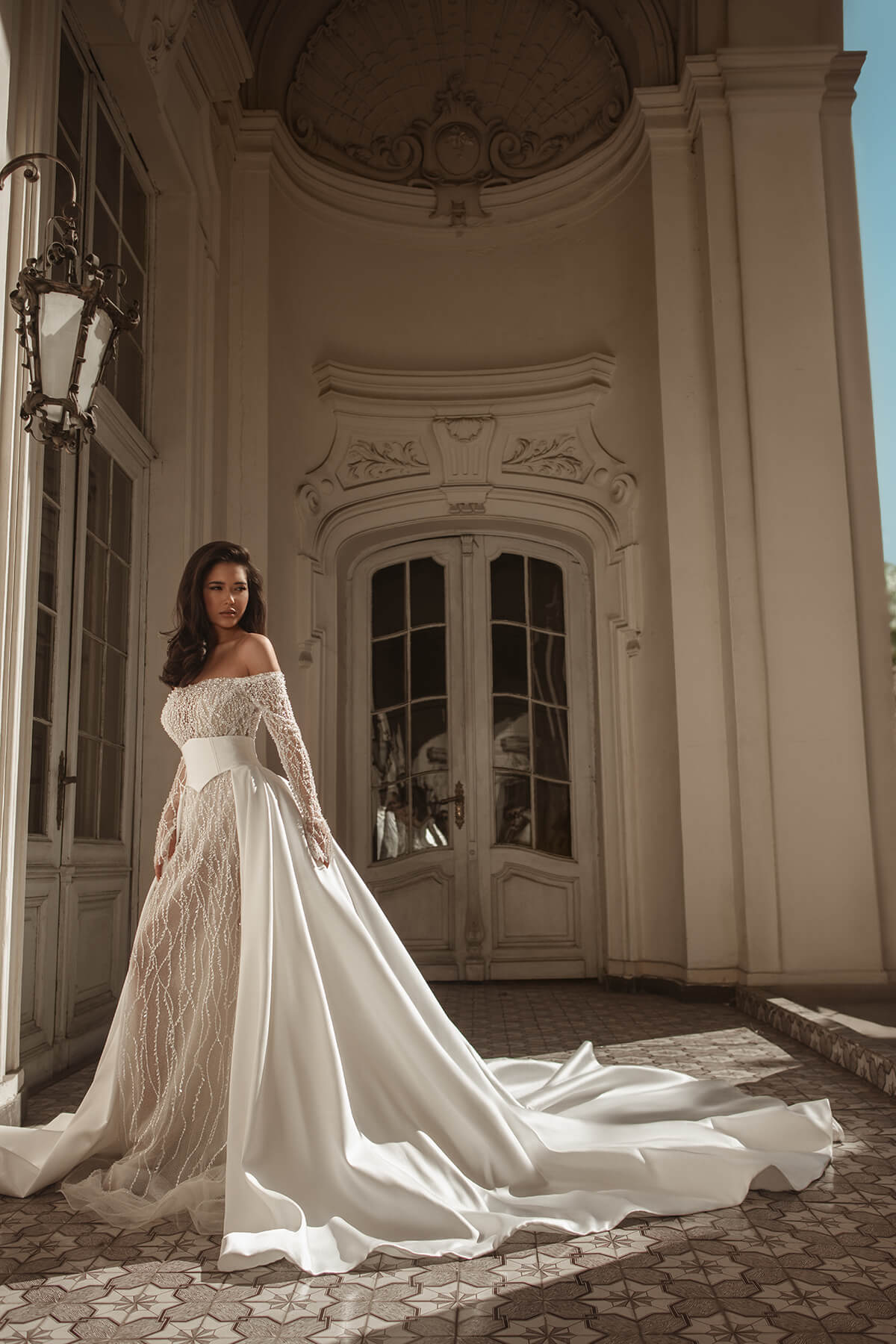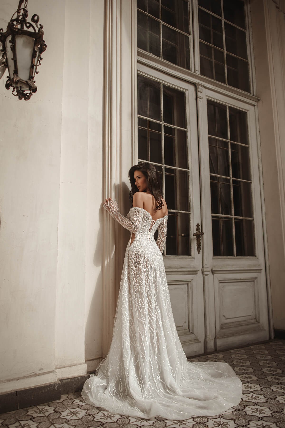 Prelepa i zavodljiva, ova sirena venčanica izrađena je od prefinjene francuske čipke sa diskretnim svetlucavim perlama, koje pružaju suptilan sjaj pri svakom koraku. Haljina poseduje duge rukave, visoki izrez i dramatično otvorena leđa, što stvara savršen balans između bezvremenske elegancije i moderne privlačnosti.