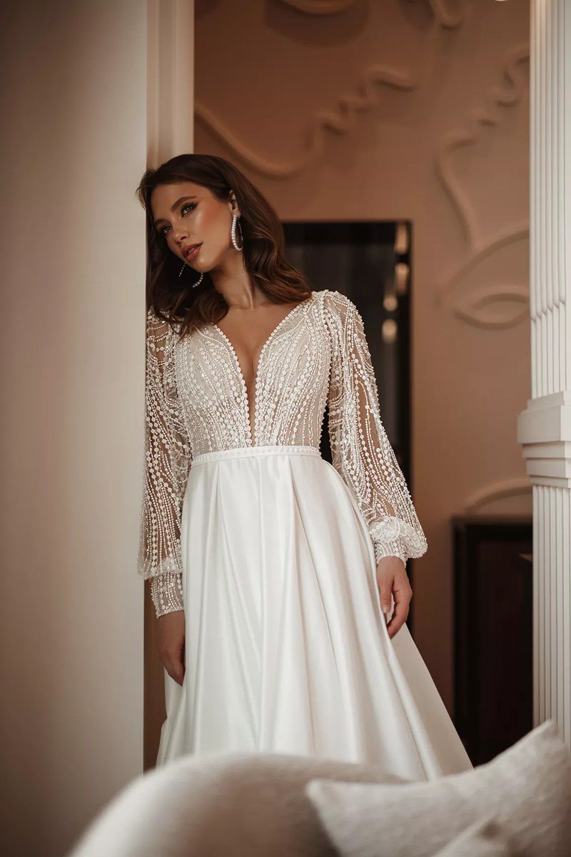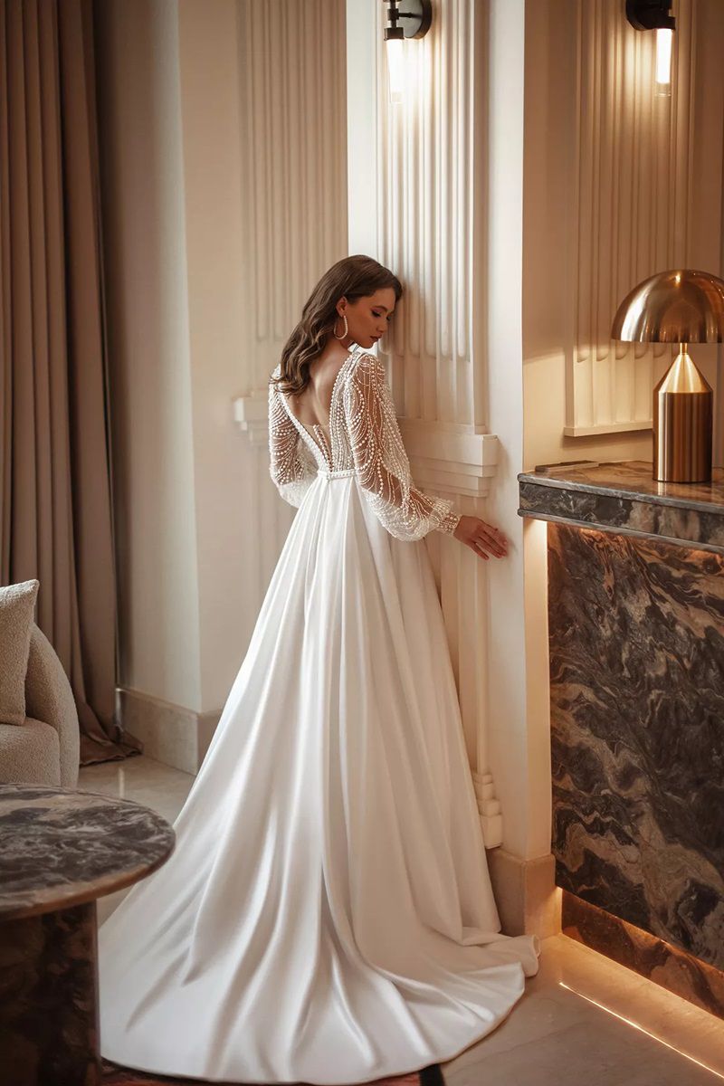 Elegantna venčanica A kroja sa raskošnom satenskom suknjom i dugačkim šlepom. Gornji deo je urađen od najfinije čipke koja je protkana bogatim perlama. Haljina ima opciono odvojive rukave. Leđa i manžetne su ukrašene bisernim dugmićima.