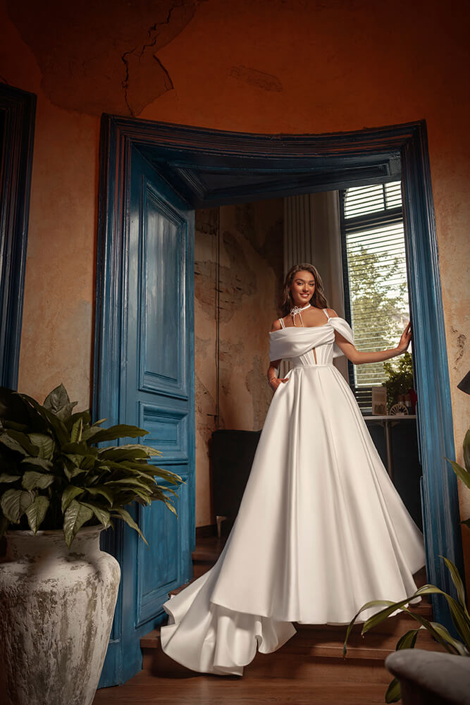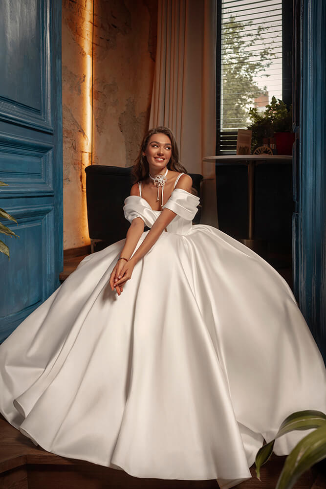 Graciozna i raskošna, ova princeza od satena stvorena je da ostavi snažan utisak. Gornji deo je čvrsto oblikovan i ukrašen nežnim cvetnim vezom, koji daje notu sofisticiranosti. Haljina dolazi sa uklonjivim bretelama koje se spuštaju sa ramena, kao i čipkastim dugim rukavima što omogućava da izgled bude klasičan, ali i lako prilagodljiv.
